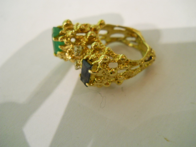 14ct gold ring with an emerald and tourmaline stone and two diamonds