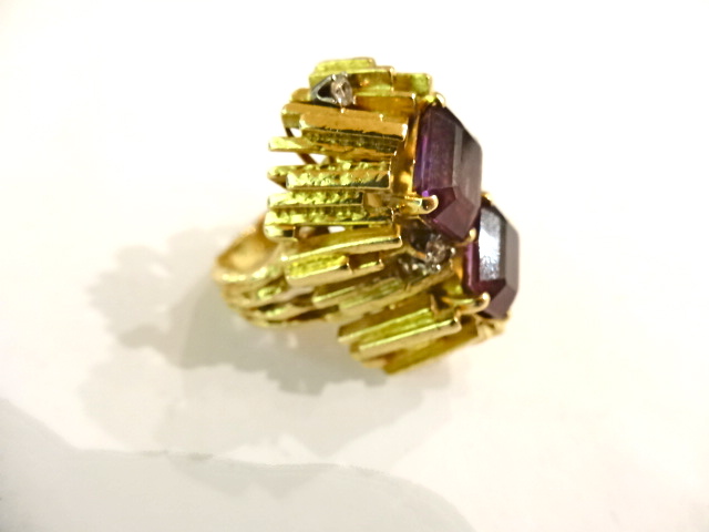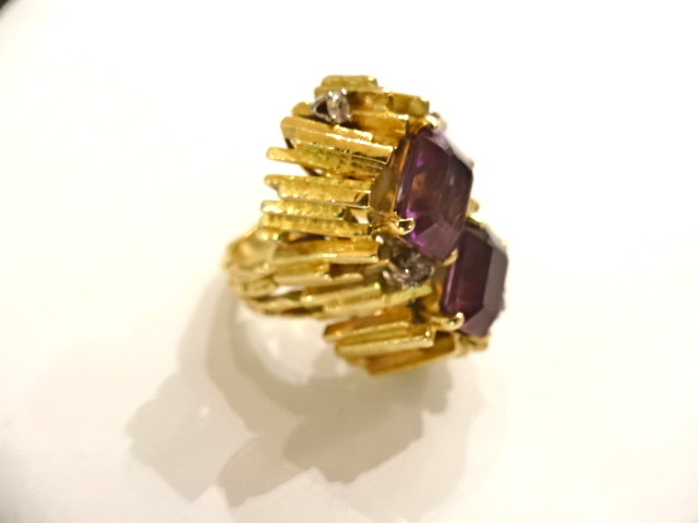 18ct GOLD,AMETHIST AND DIAMOND 70s RING £1,950.00 Home British (sold) 18ct GOLD,AMETHIST AND DIAMOND 70s RING This item has been sold. Photo Gallery All photos (3) 18ct GOLD,AMETHIST AND DIAMOND 70s RING × Great ring with two amethists,trxtured rods of gold. Size K. No makers marks ut a well made ring from the period. Listing ID: 877545cde6ae7014 Share Interested in this item Contact us at the following email address: sandy@sandystanleyjewellery.co.uk
