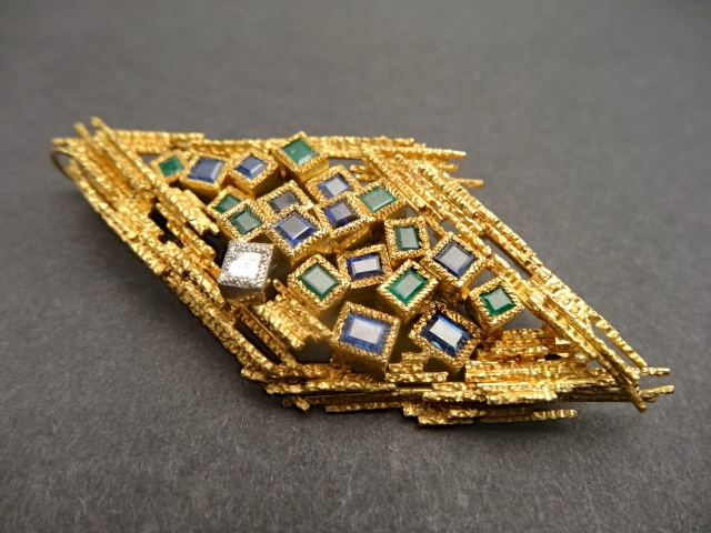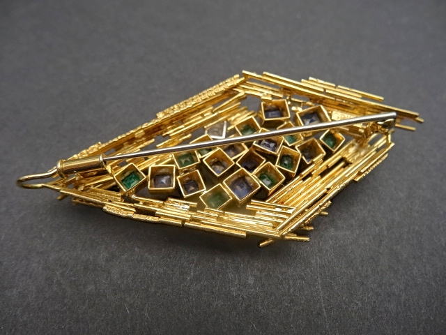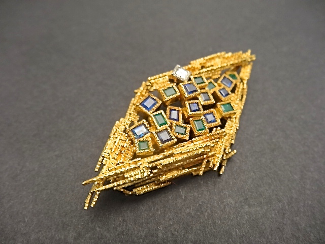 ANDREW GRIMA 18ct GOLD,EMERALD AND SAPHIRE BROOCH/PENDANT