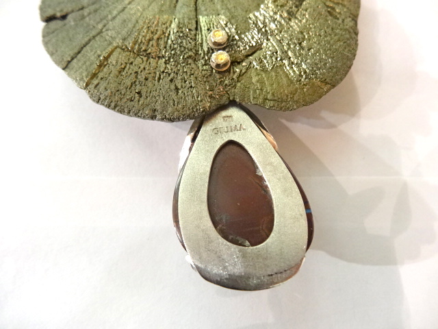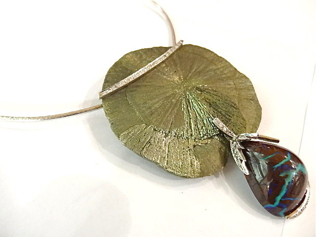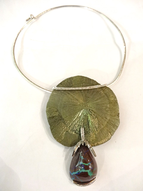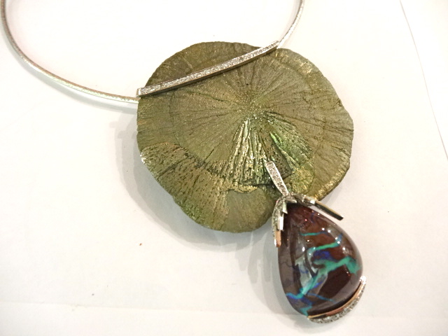 ANDREW GRIMA PENDANT ON WHITE GOLD TORK WITH DIAMONDS,OPAL AND A LARGE PIECE OF UNKOWN STONE