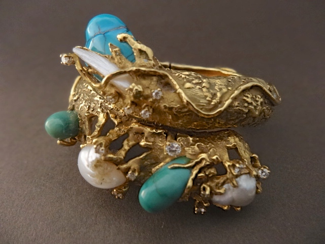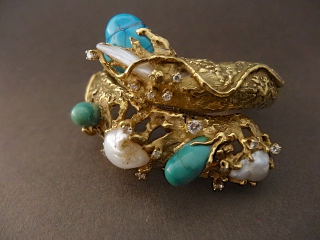 ARTHUR KING 18 ct BANGLE WITH PEARLS, DIAMONDS AND TURQUOISE,SINED