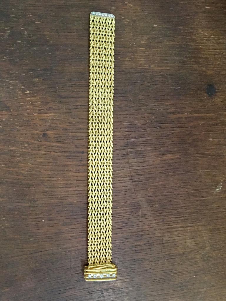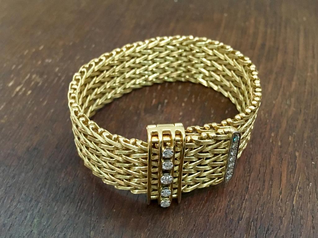 BRITISH BRACELET IN WOVEN 18CT GOLD WITH DIAMONDS, 1960S Home British (sold) BRITISH BRACELET IN WOVEN 18CT GOLD WITH DIAMONDS, 1960S This item has been sold. Photo Gallery All photos (3) BRITISH BRACELET IN WOVEN 18CT GOLD WITH DIAMONDS, 1960S × Beautifully made bracelet which can be attached at any point so can be a flexible size Listing ID: 8435da38c1e46748 Share Interested in this item Contact us at the following email address: sandy@sandystanleyjewellery.co.uk