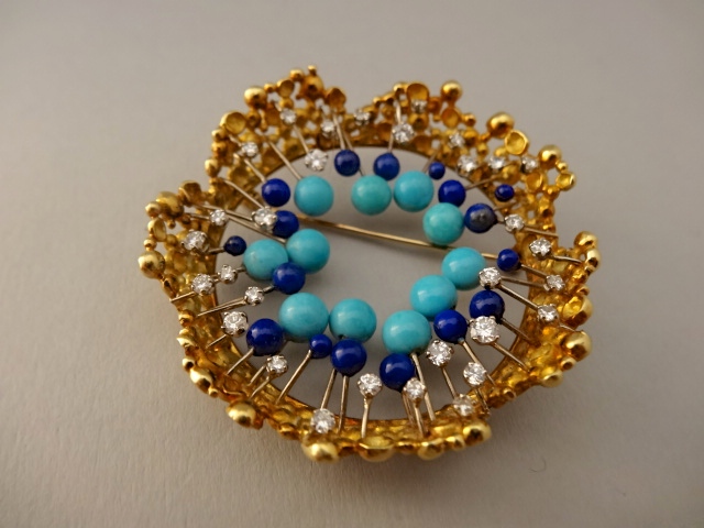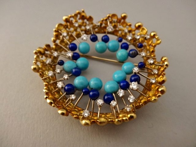 BROOCH IN TURQUOISE AND LAPIS,WITH DIAMONDS UNSIGNED JOHN DONALD “CROWN BROOCH” Home British (sold) BROOCH IN TURQUOISE AND LAPIS,WITH DIAMONDS UNSIGNED JOHN DONALD “CROWN BROOCH” This item has been sold. Photo Gallery All photos (3) BROOCH IN TURQUOISE AND LAPIS,WITH DIAMONDS UNSIGNED JOHN DONALD "CROWN BROOCH" × Great brooch with London hallmarks for 72 with many small brilliant cut diamonds, similar brooches in the book by John Donald Listing ID: 404599841b3b8749 Share Interested in this item Contact us at the following email address: sandy@sandystanleyjewellery.co.uk