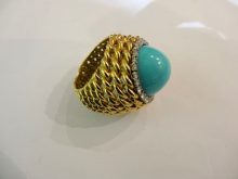 LARGE 18CT GOLD TURQUOISE AND DIAMOND RING,NO MARKS £1,750.00 Home Modernist (sold) LARGE 18CT GOLD TURQUOISE AND DIAMOND RING,NO MARKS This item has been sold. Photo Gallery All photos (3) LARGE 18CT GOLD TURQUOISE AND DIAMOND RING,NO MARKS × Probably American, 1970s cocktail ring. Listing ID: 2445511ede66cd2e Share Interested in this item Contact us at the following email address: sandy@sandystanleyjewellery.co.uk