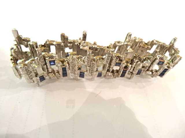 WHITE GOLD,DIAMONDS AND SAPHIRE BRACELET,lONDON 1973 WITH MAKERS MARKS £5,900.00 Home British (sold) WHITE GOLD,DIAMONDS AND SAPHIRE BRACELET,lONDON 1973 WITH MAKERS MARKS This item has been sold. Photo Gallery All photos (3) WHITE GOLD,DIAMONDS AND SAPHIRE BRACELET,lONDON 1973 WITH MAKERS MARKS × Wonderful bracelet with 16 good sised diamonds and many small diamonds,45 small saphires. 102 grammes of 18ct. Makers marks indistict but looks like AC Co. Listing ID: 130544a5d5a1bb3c Share Interested in this item Contact us at the following email address: sandy@sandystanleyjewellery.co.uk